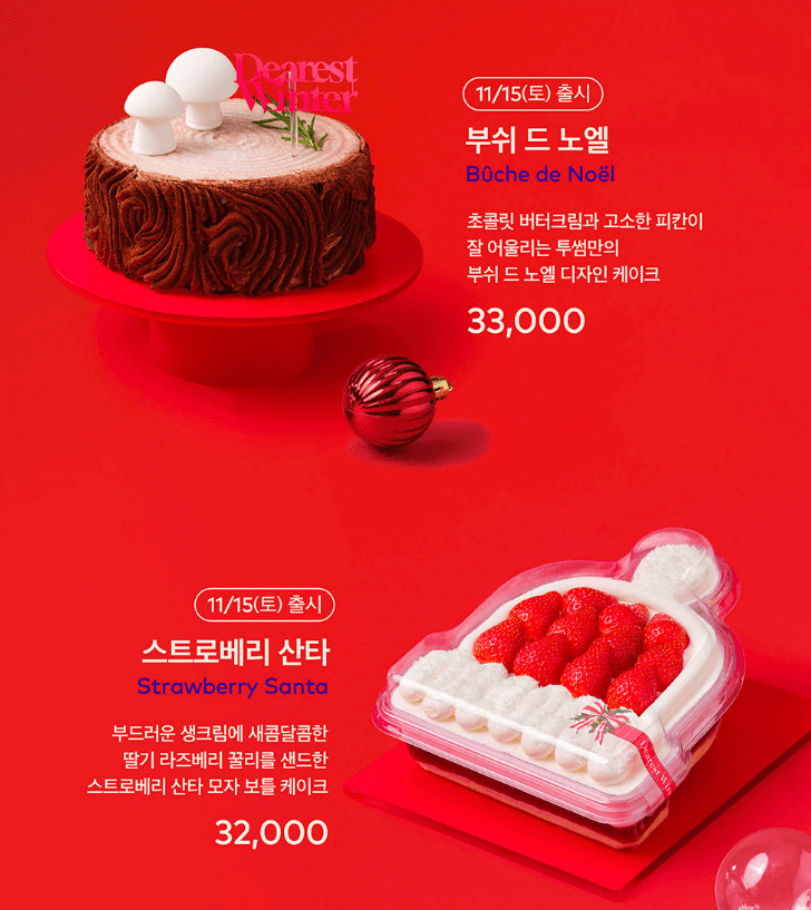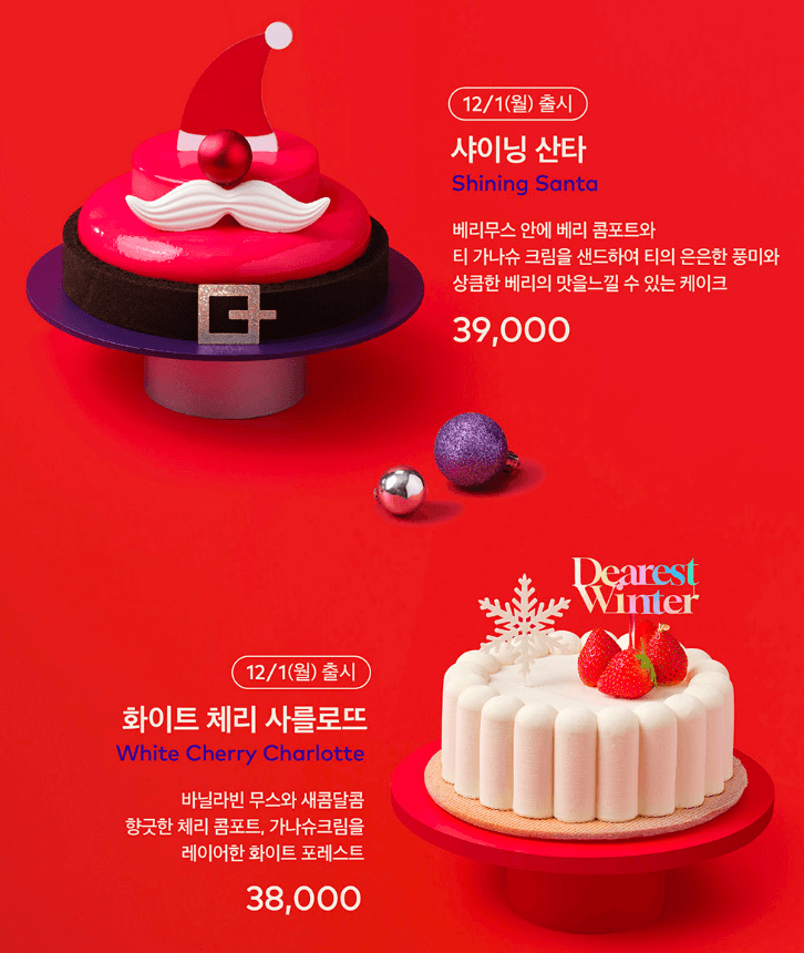 이 모든 제품이 크리스마스 홀리데이 케이크로 예약 가능하며, 일부 제품은 12월 1일부터 출시되니 참고해 주세요.